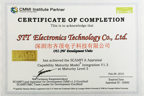 2016年1月份,在齊頂科技CMMI3級(jí)認(rèn)證結(jié)果發(fā)布會(huì)上,主任評估師宣布:深圳市齊頂電子科技有限公司已經(jīng)達(dá)成了CMMI3級(jí)目標(biāo),成功通過CMMI3級(jí)認(rèn)證。這是齊頂電子在軟件開發(fā)和管理標(biāo)準(zhǔn)方面發(fā)展的里程碑,標(biāo)志著公司的軟件能力成熟度和項(xiàng)目管理水平與國際主流模式接軌。