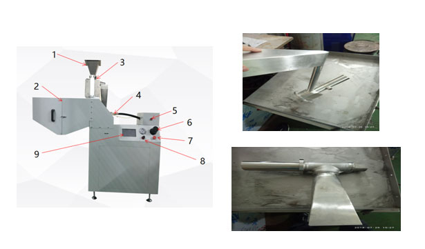 角度可調(diào)碰撞室、3D碰撞室、噴槍、氣動震動進(jìn)料口、收集箱、電控柜、PLC顯示屏